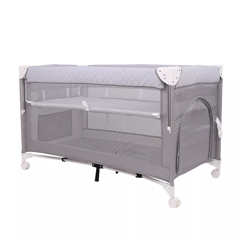 Das zusammenklappbare und hebbare Babybett P1201 von Bebevovo kann als Kinderbett, Beistellbett und großer Spielbereich verwendet werden. Es ist in eine mittlere Schicht und eine untere Schicht unterteilt. Durch Zuziehen des Reißverschlusses lässt sich die Mittelschicht in ein bequemes Schlafbett für Ihr Baby verwandeln. Die Seitentaschen lassen sich in der Höhe verstellen, sodass Babyutensilien immer griffbereit verstaut werden können. Die untere Ebene kann als geräumiger Spielbereich für ältere Babys genutzt werden und kann durch Öffnen des Stützrahmens auch als Babywiege genutzt werden. Das zusammenklappbare und hebbare Babybett P1201 besteht aus hochwertigem Oxford-Stoff und Aluminiumlegierungs- oder Eisenrohren, die langlebig sind.